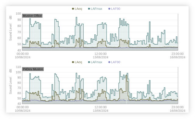 You can view the long term noise reports from a single noise monitor or from multiple noise monitors at the same time. The report can be from a single day, week, month or whatever period suits your requirements. The reports can be exported to PDF format (for ease of printing and sharing with others) or to CSV format to be imported to a spreadsheet or word processor.